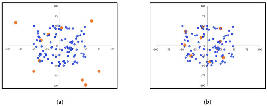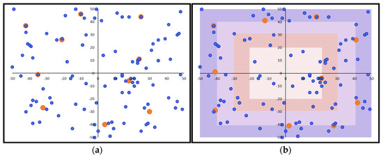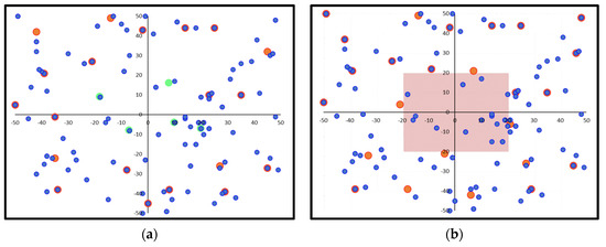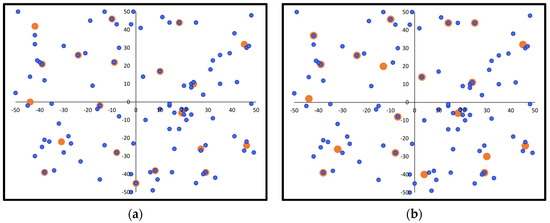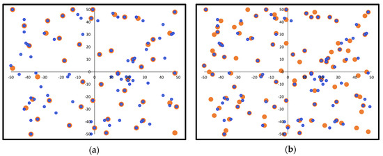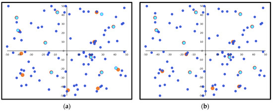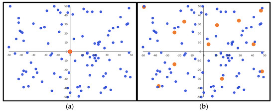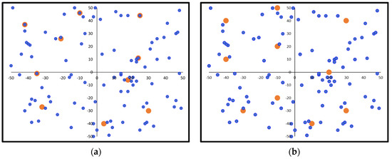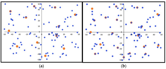 Indicative charging station deployment example for a −100 to 100 field range: (a) initial random solution; (b) final optimal solution (demand points in blue color, charging stations in orange color).