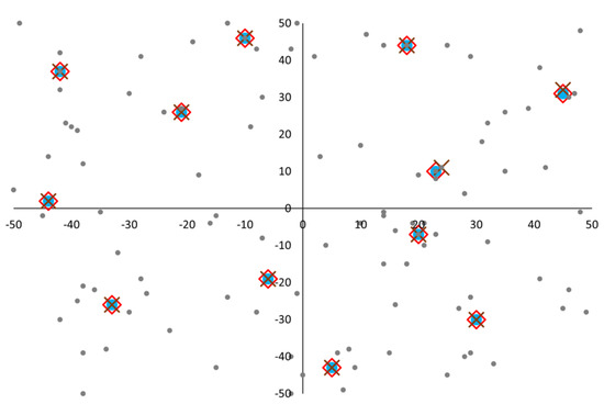 An interesting research question with practical importance is the adjustment of the solutions to the uneven shape of a typical city or neighborhood area. There are two ways to deal with this issue, either consider the city shape as it is or develop a square (or rectangle) that surrounds the city shape. In the first case, the solution space is reduced to the city shape; however, a large number of constraints should be added to model the city limits. In the latter case, the solution space increases, but the simplicity of the algorithm in terms of constraints is retained. As part of this analysis, the solution space of the basic scenario was extended, considering solution space dimensions ranging from −100 to 100 in both directions (4 times larger than the original area) and −200 to 200 in both directions (16 times larger than the original). The demand points and size remained as originally (within the −50 to 50 range) while different initial station allocations were considered, from all stations being at point (0, 0) to randomly assigned within the large box. Figure 10 provides an indicative solution for the case of an area ranging from −100 to 100, in which 10 charging stations are to be deployed, while Table 2 summarizes some results of the process regarding the fitness value of the total distance traveled. Not surprisingly, the algorithm, after some exploration of the whole space, has always converged to a solution very similar to the initial one and, interestingly, within the same computation time. This can highlight the GA converging capability regardless of the space size and the initial station placement.