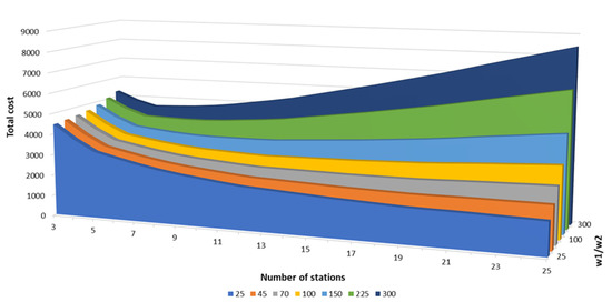 Unlike most previous studies that solely focused on charging station allocation, the present algorithm can simultaneously handle the multi-objective problem of obtaining the optimal number of stations along with their optimal placement. This problem follows the classical trade-off between the cost of the charging station development, which relates to the number of stations and their construction cost, and the cost of EV total travel distance, which decreases with the number of charging stations. This means that as the EVCS network becomes denser, the EV user can more easily find a nearby available station to charge at and, therefore, reduce the daily travel distance. However, the number of charging stations should be determined and kept at a certain level, based on the charging demand, the size of the area of interest/service coverage, as well as any budget availability constraints. A number of runs have been made for different values of the w1/w2 ratio of Equation (3) (i.e., the relative weights of the model objective function). For instance, with w1/w2 = 100, the optimal number of stations is 12 (based on repetitive runs). The full picture of this investigation is depicted in Figure 7. At a low value of w1/w2 = 25, the optimal number of stations is 25, while at w1/w2 = 300, a network of 5 stations provides the best solution. The wi’s are the input values representing each specific charging station deployment area and provide the appropriate number of stations that better serves the tradeoff between deployment cost and EV travel cost. In terms of computational effort, the multi-objective configuration requires more time (as it solves a more complex problem), which, compared to the single-objective travel distance problem, presents an increased time by an order of 1.3 to 1.5 times in average values.