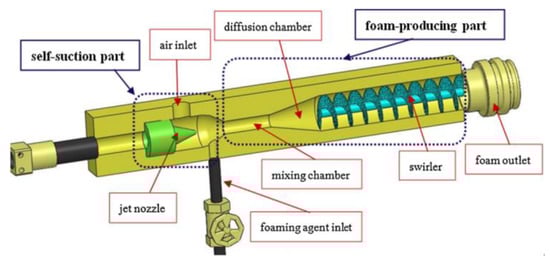 New systems for the suppression of foam dust have been widely investigated and applied in recent years due to the advantages of having a large dust-catching area, strong adhesion capacity, and fast wetting speed. Figure 2 illustrates a new foam dust suppression system designed by Wang et al. [6], which has a self-priming device to optimize the foam generator, the distribution bracket, and the nozzle so that it can automatically inhale air and the foaming agent through high-pressure water flow. A more refined foam-spraying structure was developed to achieve more concentrated and uniform foam dust suppression at the dust source. Due to the removal of external equipment and the simplification of the excavation system, the efficiency of dust suppression and foam utilization was improved.