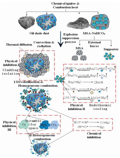 Figure 3. Schematics showing the inhibition of oil shale dust explosion using the MSA-NaHCO3 composite powder as an explosion inhibitor [9].