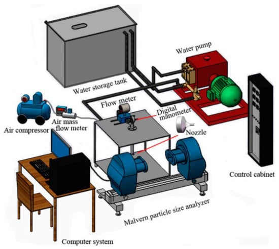 Li et al. developed a mathematical model for the prediction of the average diameter of ultrasonic atomization nozzles for liquid media by designing a new system that can be applied to engineering sites [10]. Several orthogonal experiments were established using a spraying experimental platform to analyze the effects of air pressure, water pressure, and outlet diameter on nozzle atomization parameters, and a multivariate nonlinear analysis method was used to build the mathematical model. The experimental platform is illustrated in Figure 4. In order to verify the validity of the model, the error rate, defined as the difference between the predicted and experimental values of a nozzle at different air and water pressure rates, was evaluated. The experimental results were compared with the SMD values of the nozzle predicted by the mathematical model, and the average error rate was only 5%. Thus, their proposed mathematical model can calculate the droplet size of the nozzle for the application of ultrasonic atomization nozzles in engineering sites.