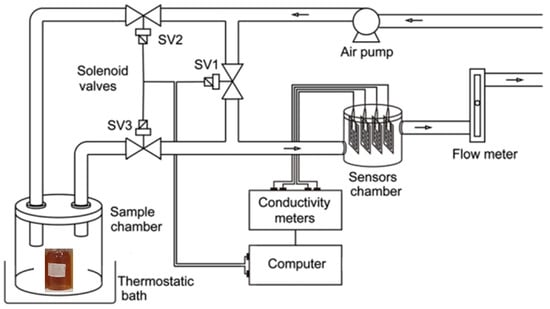 Concerning the e-nose and software for data acquisition, the system used in this work was the same as previously described [27]. Briefly, the software controls the solenoid valves (SVs) and acquires data. For evaluating the changes in the conductance of the electrode according to the sample, SV1 and SV3 are opened and SV2 is closed; thus, gas passes through the sample chamber and goes to the sensor chamber (exposure). In contrast, for removing the sample VOCs (recovery), valves are set in the inverse way: SV1 and SV3 are closed, and SV2 is opened (Figure 1).