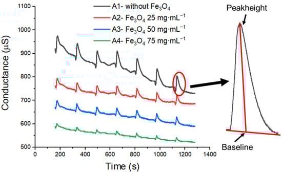 Comparing the curves in Figure 2, it is possible to note that in general, increasing the concentration of Fe3O4 led to a decrease in the signal amplitude, which is consistent with our previous work [25]. The peak height and baseline signal (inset Figure 2) were used to calculate the relative response (RR; Equation (1)) of the sensors in each of the cycles. The data of RR obtained for the sensors during each cycle are presented in Table S1.