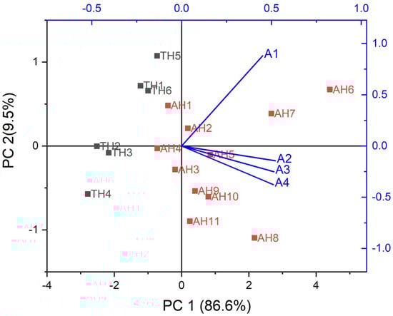PCA biplot obtained for authentic honey (TH, ◼) and adulterated honey (AH, ◼) based on average RR data.