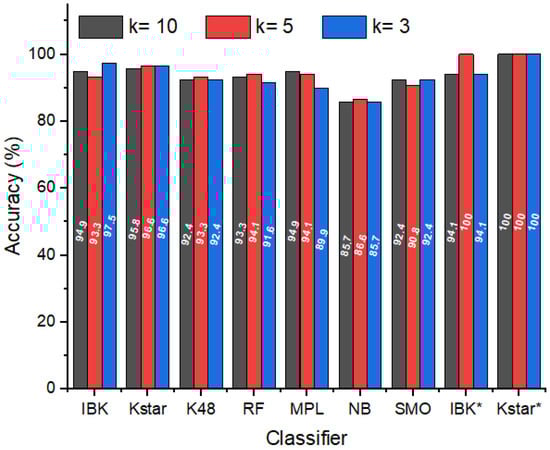 In this analysis, the following classifiers were used: instance based (IBK), Kstar, Trees-J48 (J48), random forest (RF), multilayer perceptron (MLP), naive Bayes (NB), and sequential minimal optimization (SMO) [31,32].