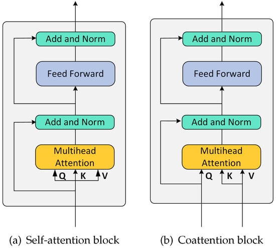In the text–image dual coattention part, we obtained the CA layer by joining two Co-Attn blocks in a parallel way, where the CA layer was computed in the same way as in the MSA block. The query, key, and value were computed separately for each Co-Attn block. The CA layer simulated the intensive interactions between the modalities by exchanging information between the input modalities.