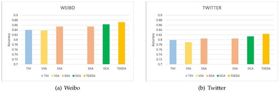 In the TDEDA model, to explore whether the individual components were effective, we conducted ablation experiments on the Weibo and Twitter datasets, respectively. In this case, the individual components were designed by fixing one component of the TDEDA model while changing the other components, and based on the experimental results, it can be seen that each component of the TDEDA model played an important role in improving the performance of the multimodal rumor detection.