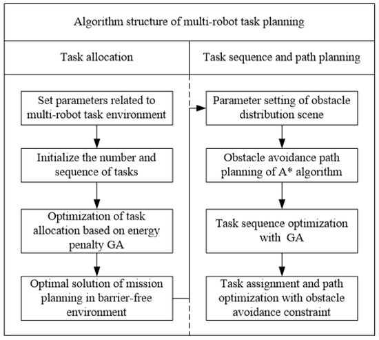This paper constructs an algorithm model based on the idea of energy penalty. The proposed model takes the robot energy consumption as the optimization goal and the robot and task attributes as constraints; it also uses GA to achieve the optimal task allocation and execution sequence optimization results. In path planning, the punishment mechanism is used again according to the obstacle avoidance requirements of the actual path, and the GA and A* methods are used to optimize the task sequence of the robot to achieve the balanced optimization of the energy consumption of multiple robots. The algorithm framework is shown in Figure 1.