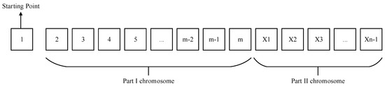 The ability of the GA to solve the MRTA problem lies in the chromosome coding method. In this paper, the two-segment chromosome coding method is adopted. Suppose the total number of tasks is m, and the first task point is the starting point of all robots, which is regarded as the virtual task point. The remaining m − 1 task points are the actual task points to be executed. As shown in Figure 2, Part I of the chromosome represents the task sequence of the robot. Part II of the chromosome represents the n − 1 breakpoint gene, which divides the Part I chromosome into n gene segments, each representing the number and sequence of tasks to be performed by the corresponding robot. The breakpoint value represents the number of task nodes, which is calculated from the first actual task point and is set according to the number of tasks performed by each robot. If the number of tasks to be performed by the ith robot is m i , i = 1 , 2 , n , the values of breakpoints are expressed as X 1 = m 1 , X 2 = X 1 + m 2 , , X n 1 = X n 2 + m n 1 .