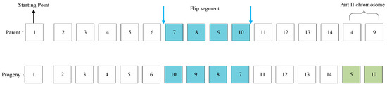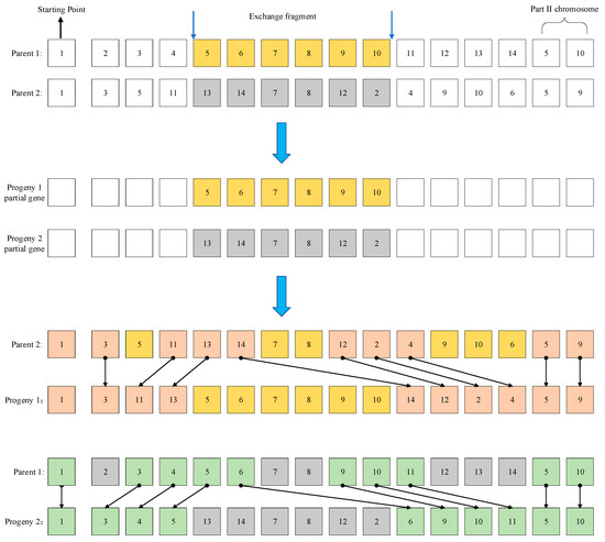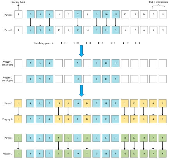 CX is used to copy part of the gene information to the offspring through multiple cyclic operations in two parents. Only one gene can be selected for each crossover in order to realize the crossover and exchange of discontinuous gene information. Then, the remaining gene information of the parent is placed in the offspring to form a new individual to complete the cyclic crossover operation, as shown in Figure 5.