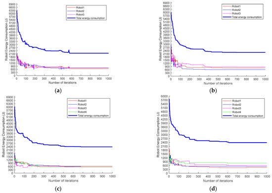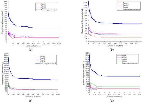 It can also be seen from the energy consumption iteration curve of the robot (Figure 10a–d) that the GA of the energy penalty strategy improves the convergence speed of genetic iteration with lower total energy consumption and better energy balance. The experimental data of the robot energy consumption and standard deviation σ are shown in Table 1.