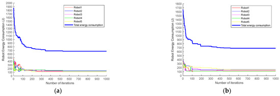 Figure 13. Iterative curve of robot energy consumption from experiment 3: (a) algorithm in this paper; (b) penalty function and genetic algorithm.