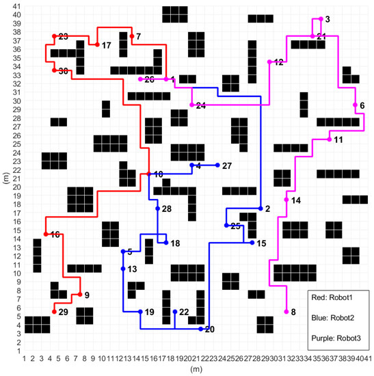 Multirobot task allocation (MRTA) decomposes a task into several subtasks under the constraint conditions of robot performance and load capacity, and coordinates the matching relationship between tasks and robots based on the principle of minimizing energy consumption and execution time. The goal is to obtain the optimal task allocation execution sequence and path for each robot to avoid task conflict, imbalance, and other problems and realize the reasonable allocation of resources. MRTA involves related technologies such as robot dynamic model [7], robot navigation [8] and environmental detection [9,10], graph search method [11], architecture for multirobot coordination [12], and so on. At present, scholars pay more attention to the research of algorithm models and implementation methods, usually using centralized and distributed task allocation models and algorithms to solve MRTA problems [13,14,15]. Distributed task allocation models mainly include game theory [16], auction algorithm [17], competitive coordination [18], the MTSP (Multiple Traveling Salesman Problem) model [19,20], and the VRP (Vehicle Routing Problem) model [21]. Many heuristic algorithms have been extensively applied in task sequence optimization and robot collaborative control, such as the neural network-based auction scheme [22], genetic algorithm for industrial plant inspection [13], and colony algorithm for agricultural machinery operation [23]. There are other methods that focus on obstacle avoidance path planning for robots to optimize task costs. Shuai et al. [24] proposed an optimal task decision method that indicates the optimal sequence and path for robots to complete certain tasks, thereby enabling warehouse robots to make optimal task decisions at minimum costs. An improved ant colony algorithm [25] coordinates the path of robots based on the priority of their residual power distribution. Because the APF (Artificial Potential Field) path planning algorithm can easily fall into the local minimum [26], Tuazon et al. [27] integrated fuzzy logic into the APF algorithm to identify and avoid local minima. The A* algorithm usually uses path length as an evaluation function and is widely used and effective in path planning [28,29,30].