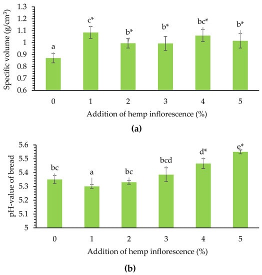 Basic physical properties of gluten-free bread with the addition of hemp inflorescence: (a) specific volumes of the breads and (b) pH values of the breadcrumbs. The mean values in the same figure marked with different letters were significantly (p < 0.05) different, as determined by the Tukey test. The means followed by an asterisk (*) differed from the control sample, as determined by the Dunnett’s test (p < 0.05).