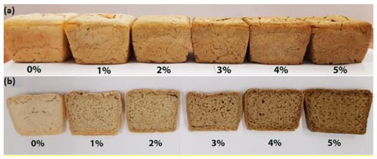 External appearances (a) and cross-sections (b) of the breads with different hemp inflorescence contents.