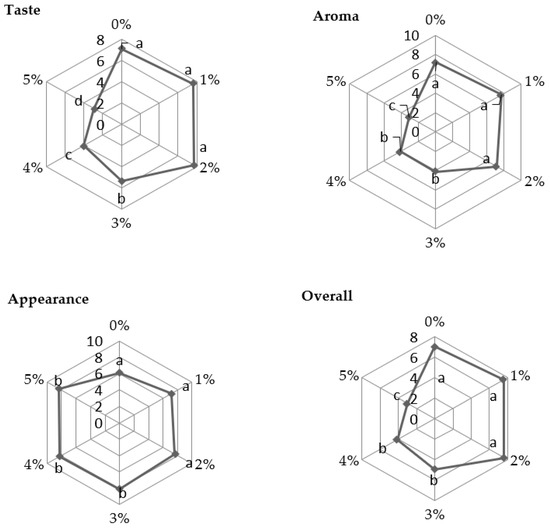 Sensory evaluations of the gluten-free breads with the additions of hemp inflorescence. The mean values in the same figure marked with different letters were significantly different (α = 0.05).