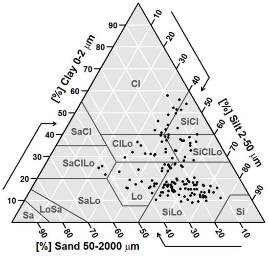 The fractions of clay, silt and sand are presented within the United States Department of Agriculture (USDA) classification system (Figure 4). This classification is divided into 12 classes of texture, 7 of which are assigned to the measurements. The samples are mostly in the silty loam class (with 77 samples), followed by loam (20), silty clay loam (16), clay loam (15), clay (10), silty clay (5) and sandy clay loam (3). With fractions between 9 and 58% for clay, between 22 and 77% for silt and between 4 and 53% for sand, the observed contents cover approximately half of the range of each component. On average, the texture is composed of 52% silt and 24% clay and sand, illustrating the dominance of the silt fraction within the study area. Moreover, 95% of samples have a sand content of less than 40%, and more than half of the points have a clay content that does not exceed 20%.
