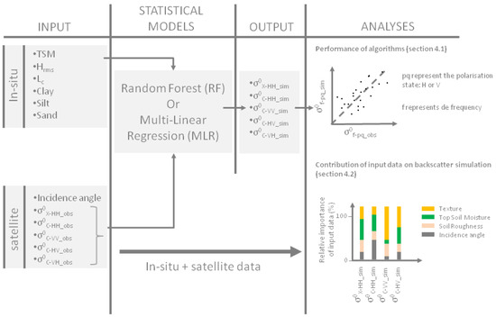 The present work addresses the estimation of backscattering coefficients at the spatial scale of the plot. The steps implemented in the estimation of backscattering coefficients are illustrated in the following synopsis (Figure 6). Microwave satellite images are first processed to obtain backscatter coefficients at the plot scale (processing steps described in Section 2.3). The backscattering coefficients are then estimated using the two statistical algorithms described below (i.e., multiple linear regression or random forest). These algorithms were implemented by considering all collected soil measurements, allowing the analysis of variable importance.
