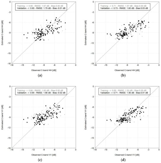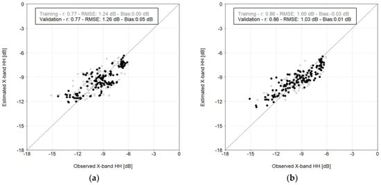 Comparison between simulated and observed backscattering coefficients in the X-band with HH polarization using MLR (a) or RF (b) statistical algorithm. The gray dots represent the estimates obtained on the training subset, while the black dots come from the validation subset.