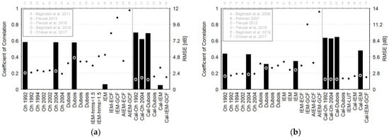 Statistical performance: RMSE (dots) and correlations (bars) obtained in previous studies by comparing the modeled and satellite-derived backscattering coefficients in the X-band in the HH polarization state (a) and in the C-band in HH, VV and VH polarizations states (b–d, respectively). In each figure, the vertical dotted line distinguishes the original models (on the left) from the modified versions of the models (on the right) [24,29,30,60,61,62,63].