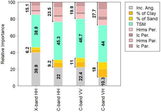 For the other variables, the order and level of importance vary with the considered satellite configuration. The effect of the incidence angle is the highest in the case of the X-band (importance of 39.9%, Figure 10), with a level close to that of the surface humidity (38.8%). This importance of the incidence angle is lower in the case of the C-band, with an average level close to 20% for co-polarizations. In the case of cross-polarization, the importance of the incidence angle is the lowest, exceeded by topsoil moisture, roughness and texture, whose levels reach 44.0, 27.7 and 18.0%, respectively. This difference between polarization states is consistent with various studies that show a low angular sensitivity in the case of signals acquired with cross-polarization [2,64,65,66]. Conversely, the large difference between signals acquired in the same polarization state (i.e., HH) in the X- and C-bands regarding the effect of the incidence angle should be interpreted with caution. Indeed, images acquired in the X-band are mainly acquired at 27.3 and 53.3°, therefore displaying a maximum angular difference of ~26°. In the C-band, this difference is smaller (close to 16°), limiting the comparison of the importance of the incidence angle between signals acquired at different frequencies.