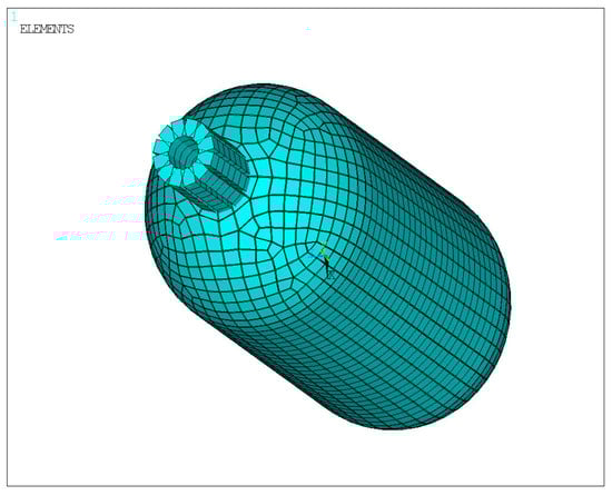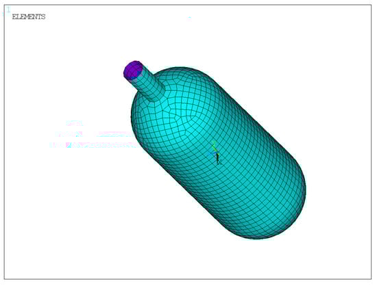 The geometric model is established in the pre-processing of ANSYS, and the mesh is divided after defining the material properties and real constants. The order of fiber layer is shown in Figure 1. For the special and complex structure of the filament wound pressure vessel, to ensure the rules of the unit, the hexahedral mesh is used to divide the grid. A total of 2086 elements are divided. The mesh division of the finite element model is shown in Figure 2, and the fiber layer mesh is shown in Figure 3.