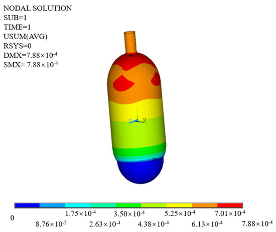 Referring to the actual situation, full constraints are applied to the bottom of the finite element model, and 30 MPa uniform internal pressure is applied on the inner wall. The stress and displacement contours output by APDL are shown in Figure 4 and Figure 5.