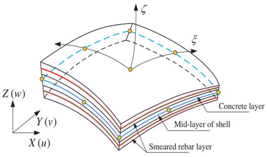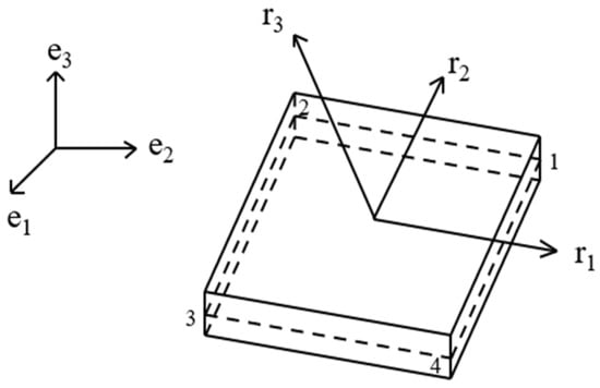 The shell element used in this paper is the ShellMITC4 element, so the material command needs to be modified. The uniaxial elastic material is modified to a three-dimensional elastic material suitable for shell element analysis, that is, the elastic material considering Poisson’s ratio. The ShellMITC4 element improves the bending performance of the thin plate by using a bilinear isoparametric representation combined with modified shear field interpolation. The so-called shell element has in-plane stiffness (membrane element, plane stress element), and also has in-plane stiffness (plate element). ShellMITC4 element is a four-node rectangular isoparametric element, as shown in Figure 6, the layered shell section model is shown in Figure 7, and the same shape function is used to describe the element displacement and element coordinates [24]. Although the element has a small number of nodes and a simple displacement mode, the discrete Mindlin technique is used to interpolate the transverse shear strain independently, so it can effectively eliminate the problems of shear locking and pseudo zero energy mode.