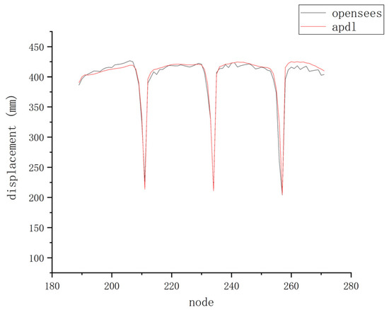 After the completion of the calculation, the data are processed, and the output data file is extracted by Python, MATLAB, and other tools. The simulation results of composite pressure vessels with different ply modes are compared by different methods: the comparison of APDL simulation and OpenSees simulation results, as shown in Figure 9; the comparison of node displacement diagrams obtained from different angles of ply under OpenSees is shown in Figure 10; the comparison of node displacement diagrams obtained by different thickness layers are shown in Figure 11.