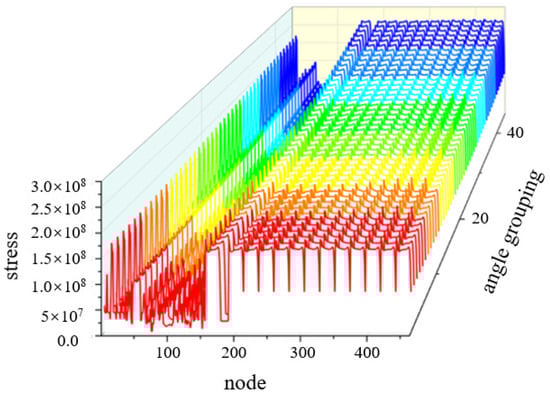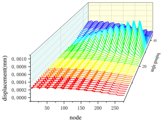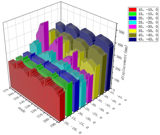 It can be seen from Figure 10 that the changing trend of node displacement is not large. With the increase of different ply angles, the node displacement also increases, and the range of fluctuation also gradually increases. In this figure, the scheme with a ply angle of 20°, −20°, and 0° has the most stable displacement and small fluctuation range.