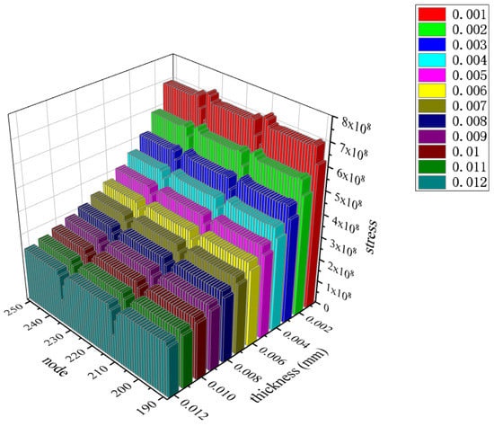 It can be seen from Figure 11 that the displacement of the nodes in the previous schemes does not change much, and the fluctuation range is small. However, when the thickness gradually increases, the displacement of the nodes changes greatly, and the displacement of individual nodes increases sharply.