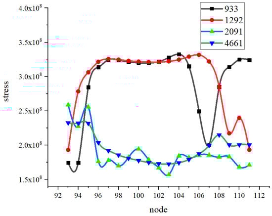 In order to explore the influence of the number of grids on the finite element analysis of composite pressure vessels, the composite pressure vessel model is meshed. The number of elements 933, 1292, 2086, 4661 is set respectively, and the constraints and loads are set. Then the stress data of the nodes near the maximum stress value are output and compared. The results show that the stress values approach the same, and the output data are shown in Figure 17. The average relative error of 2086 and 4661 elements is 4.35%. Therefore, even if the number of grids increases, the stress value of the same part is less affected, and the stress value tends to converge.