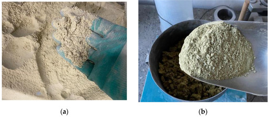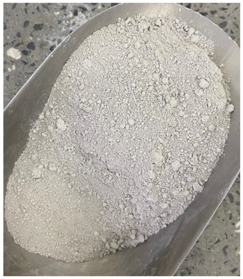 Metakaolin is a product, or more precisely a by-product, created by firing kaolin at high temperatures. Chemically, it is an aluminosilicate. It is a very efficient pozzolanic material that can be successfully used in mortars [16]. In contrast to kaolin, which has a crystalline structure, metakaolin is amorphous. Due to its amorphous structure, metakaolin is very reactive when in contact with an alkaline solution [17]. For this reason, metakaolin is ideally applicable as a raw material for the production of geopolymer [18,19] The metakaolin used for this study (Figure 4) comes from the producer ASTRA MK-40 [20]. The relative density of the metakaolin used in the study is 2.30–2.80 g/cm3. The specific surface area of the material, as specified by the supplier, is 20,000 cm2/g.
