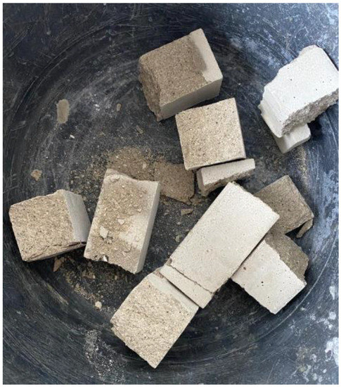 The purpose of preparing the mortars was to further test them for compressive and flexural strength and leaching tests [22]. The geopolymer was forged in 40 × 40 × 160 mm moulds and heat-treated for 48 h at 70 °C for geopolymer mortars and for 72 h at 45 °C for cement mortars. The test samples were then cured under laboratory conditions for an additional 26 days at an air temperature of approximately 20 °C and a humidity of approximately 50%. After this time, flexural and compressive strength tests were performed on the crushed samples (Figure 6).