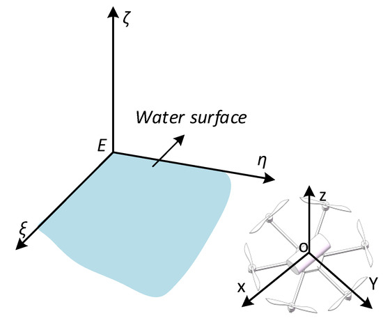To facilitate the study of the dynamic and kinematic model of the amphibious multi-rotor UAV, this paper establishes a coordinate system as shown in Figure 2. is the coordinate system consisting of a fixed coordinate system established on the horizontal plane, and is an airframe motion coordinate system fixed on the amphibious multi-rotor UAV.