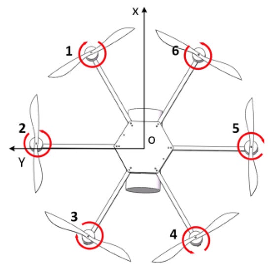 Let the propeller speed of the propeller be , and the six propeller speeds be , then the thrust generated by the vehicle propeller system and its moment can be obtained as