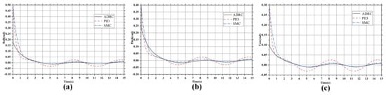 Simulation results of PID, SMC and ADRC out-of-water motion attitude angle control: (a) roll angle, (b) pitch angle, (c) yaw angle.
