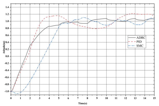A simulation experiment using MATLAB with a simulation time of 15 s; given the initial position and the desired position ; initial positions of , , and , and desired positions of , and . The parameters of the PID controller and SMC controller are also adjusted to show better control performance, and the parameters of the ADRC controller are adjusted to meet the control requirements. The final simulation results are shown in Figure 6 and Figure 7.