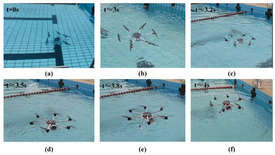 In 2018, Ma et al. [14] designed and experimentally validated an adaptive sliding mode controller to reduce the effect of parameter uncertainty on aircraft stability. In 2018, Mercado Diego et al. [15] designed a hybrid controller for the trajectory tracking of an air-submerged motion system for an air–air amphibious multi-rotor vehicle based on the hybrid control system concept, and experiments confirmed that the hybrid controller can effectively accomplish trajectory tracking. In 2019, Zha et al. [16] introduced a small unmanned underwater vehicle (UUAV) similar to the conventional quadcopter and proposed a strategy to break the calm water surface. However, the paper clarifies the point that further analysis of underwater dynamics in submerged and transition states should be carried out.