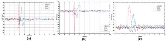 Experimental results of attitude angle control of PID, SMC, and ADRC out-of-water motion: (a) roll angle, (b) pitch angle, (c) yaw angle.