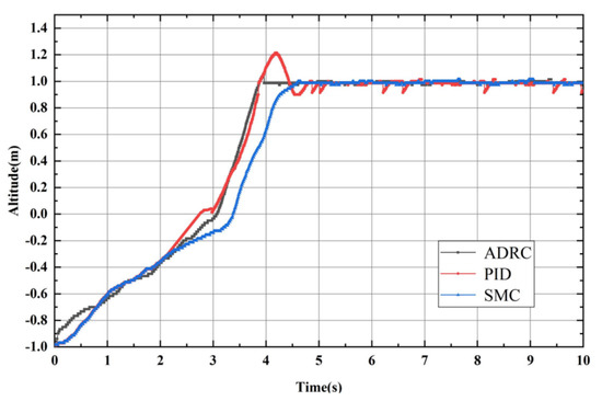 Based on the out-of-water motion control of an amphibious aircraft, it can be seen that before reaching z = 0, since the model parameters did not change significantly and the controller parameters were adjusted to the optimal condition for the experiment, the control curve of the three control algorithms, PID, SMC, and ADRC, all showed a certain anti-interference ability against external disturbances. When the aircraft reaches z > 0, the force situation changes dramatically, and the PID controller curve jumps up and down at 3 s, indicating the aircraft wobbles at the water–air interface, which may lead to the amphibious aircraft’s rotor flaps to the horizontal plane resulting in the amphibious aircraft rolling over and falling into the water. Finally, the PID algorithm also generates a large overshoot of 0.2 m, which indicates that the PID algorithm cannot overcome the instability caused by the change in model parameters. The control curve of the SMC algorithm is smooth and shows no obvious overkill. However, there is a 0.5 s delay in the control effect when dynamic models and parameter switching occur. Compared with the control curve of the ADRC algorithm and PID algorithm, it can be considered that part of the control rapidity is sacrificed and the control robustness is improved. Compared with the PID algorithm and SMC algorithm, the control curve of the ADRC algorithm exhibits no significant step changes after the amphibious aircraft transitions from water to air. Furthermore, the control curve remains smooth without any noticeable overshoot. On the premise that the robustness of the control algorithm is guaranteed, good control rapidity is also retained.