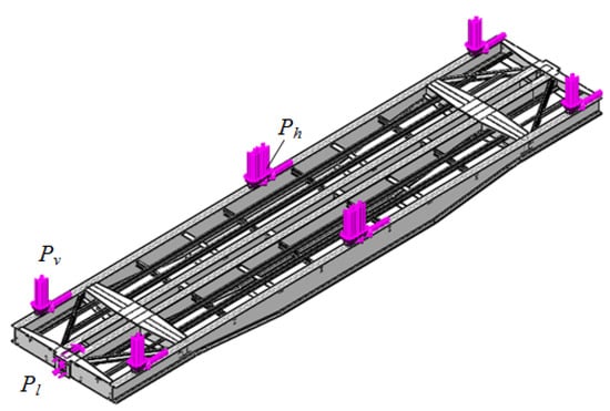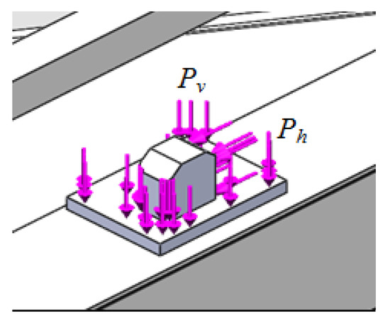 The design diagram of the flatcar frame included the impact force Pl = 3.5 MN (Figure 1), the vertical impact force Pv to the fixed fitting from the containers, and the horizontal force Ph as a result of a collision between the container fitting and the fixed fitting (Figure 2). The magnitude of the horizontal force applied to the pin of the fixed fitting was determined by mathematical modeling on the basis of the models developed in previous publications by the authors’ team.