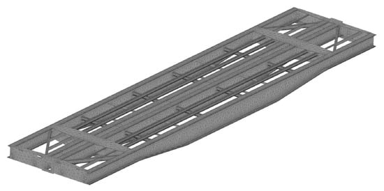 In this case, the number of elements forming the mesh was previously calculated. In the areas where there was a connection between the frame beams or parts, the mesh was automatically compacted. The number of nodes in the mesh was 311,601, and the number of elements was 932,166. The maximum element size was 100 mm, and the minimum was 20 mm. The finite element model of the bearing structure of the flatcar is shown in Figure 3.