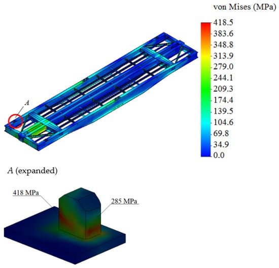 The results of the research are given in Figure 3. It was found that, during a shunting collision to the flatcar, the maximum equivalent stresses were about 418 MPa; they were concentrated in the fixed fittings (Figure 4). The maximum displacements amounted to 12.1 mm. This magnitude of displacements was due to the fact that the model was secured on the center plate and the middle part was loaded with the vertical force from the containers.