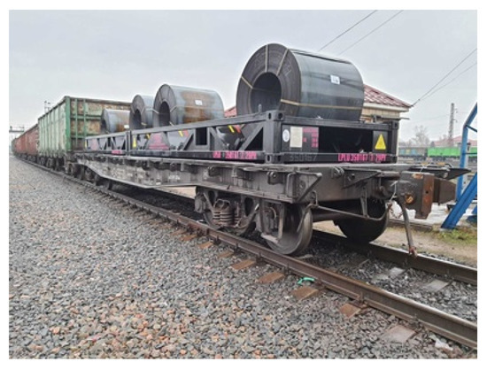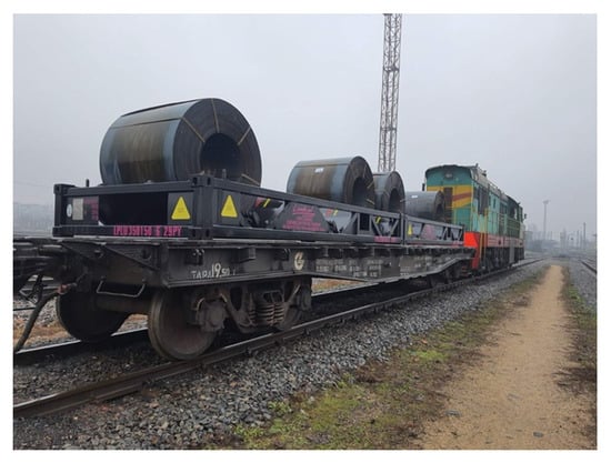 During the tests, the flatcar was loaded with coiled steel (Figure 5). The gross weight of the freight was identical to the gross weight of two containers.