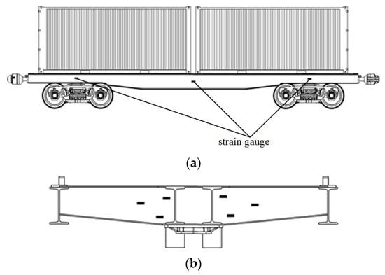 Strain gauges on the main longitudinal beam of the flatcar: (a) middle part; (b) end part.