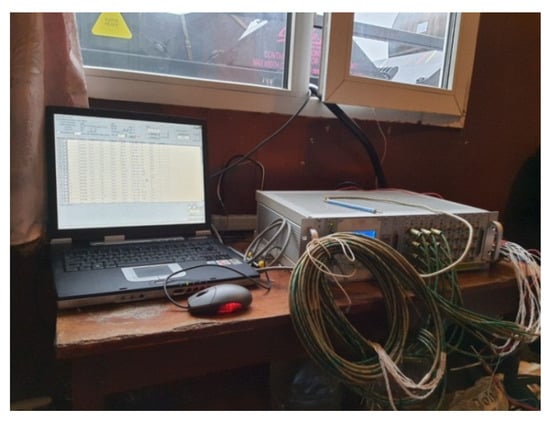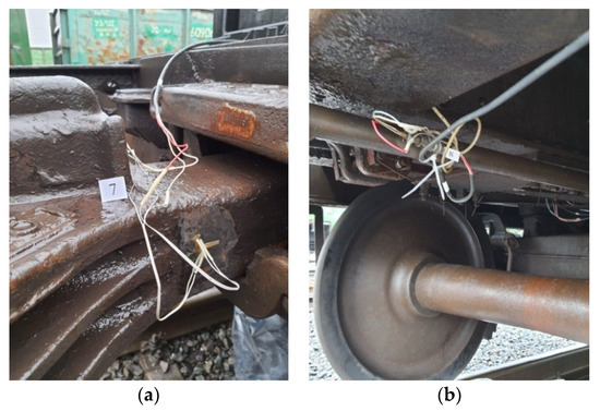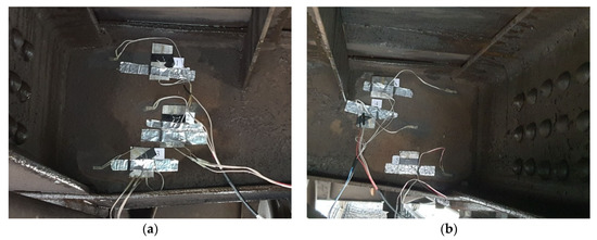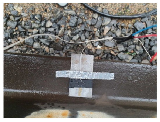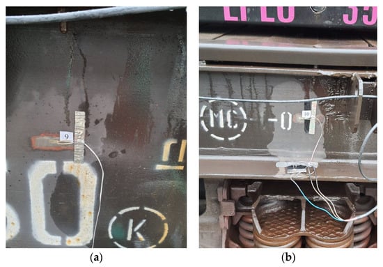 The strain gauges were installed on the surfaces, which were prepared, cleaned, and treated with alcohol in advance. The prepared surfaces and the strain gauges were treated with a thin coat of glue, and when the glue dried, they were coated with glue again; after these procedures, the strain gauges were attached to the surface of the bearing structure. The strain gauges were glued with cyanoacrylate-based thermosetting adhesive. The gauges were pressed, and the remaining glue was removed. The outputs of the strain gauges were connected to the measuring equipment; some time was spent on glue drying. Before the installation of the strain gauges, the surfaces of the flatcar were dried with a heat gun. In order to exclude the influence of weather conditions while reading the gauges, they were coated with a thin Vaseline layer. Paraffin could also be used instead. A bitumen tape was used to secure the plates with compensating strain gauges (Figure 7).