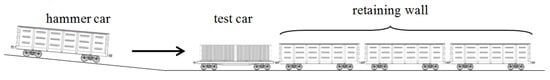 The strength tests for the flatcar were carried out at the dynamic mode with various impact speeds in the interval and conditions specified in [29]. The flatcar moved along a horizontal track section of the hump yard (Figure 13).