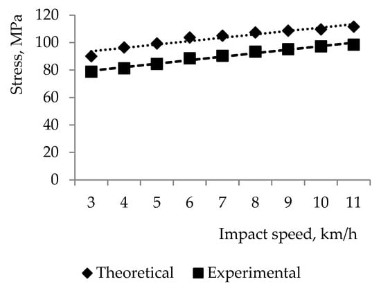 It was assumed that the model under study was linear (single factor) and described a change in the stresses of the flatcar frame according to the impact speed. The results of measurements are showed in Table 3 and Figure 17. The theoretical values of stress in the flatcar frame were determined according to the design diagram shown in Figure 1.